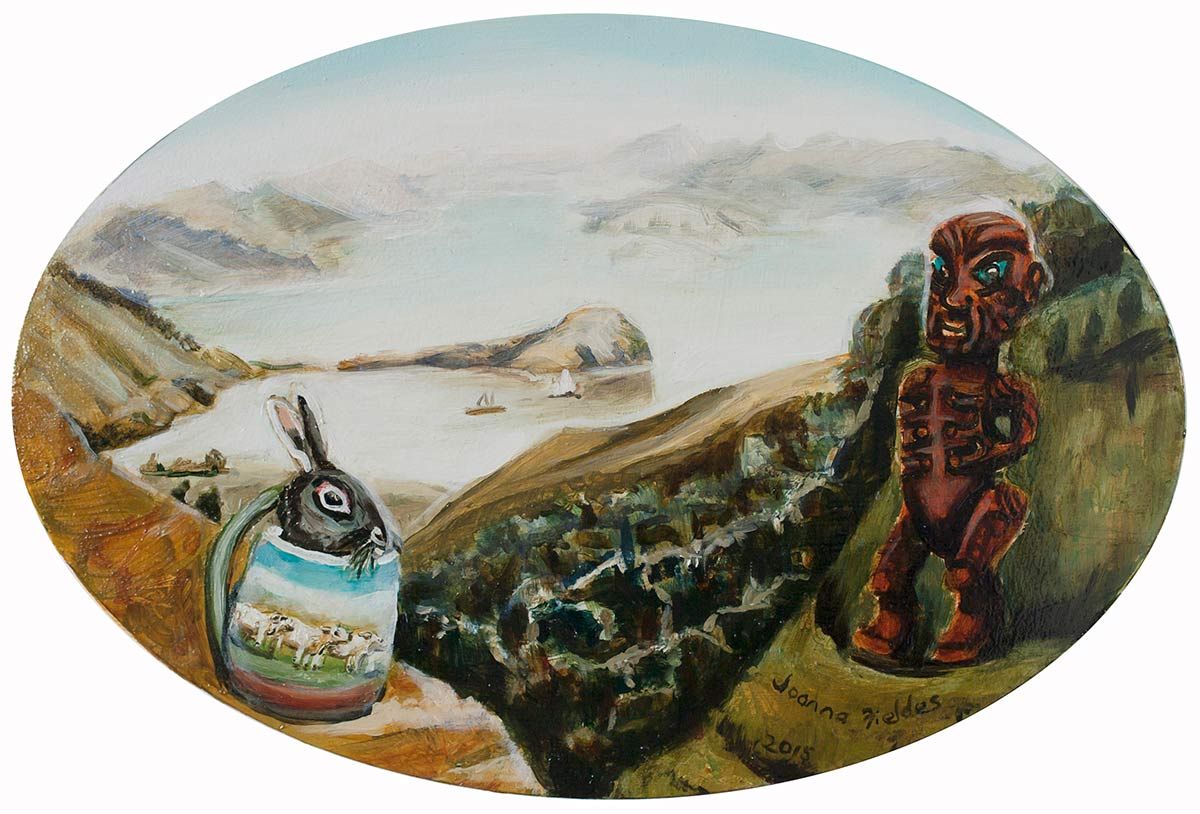 Papakura Art Gallery presents a new exhibition of oil paintings by artist Joanna Fieldes, with works selected from the last 10 years of her art practice. Recent works are based on both south and west Auckland locations. Those works are accompanied by landscape paintings based on her memory of places across New Zealand. These paintings provide a backdrop for a cast of characters, who combine and merge their shape with iconic New Zealand ceramics. These hybrid creatures are bound by the push and pull of their relationships.