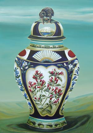 “With this painting I have used the special co-operation between the two countries and cultures as inspiration. I have used a traditionally shaped Japanese vase with lid as the icon, symbolizing Japan and the Japanese culture which encapsulates all the experience and knowledge of the Japanese Gentian industry.