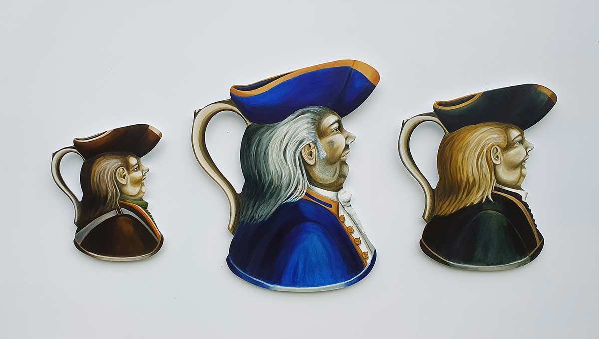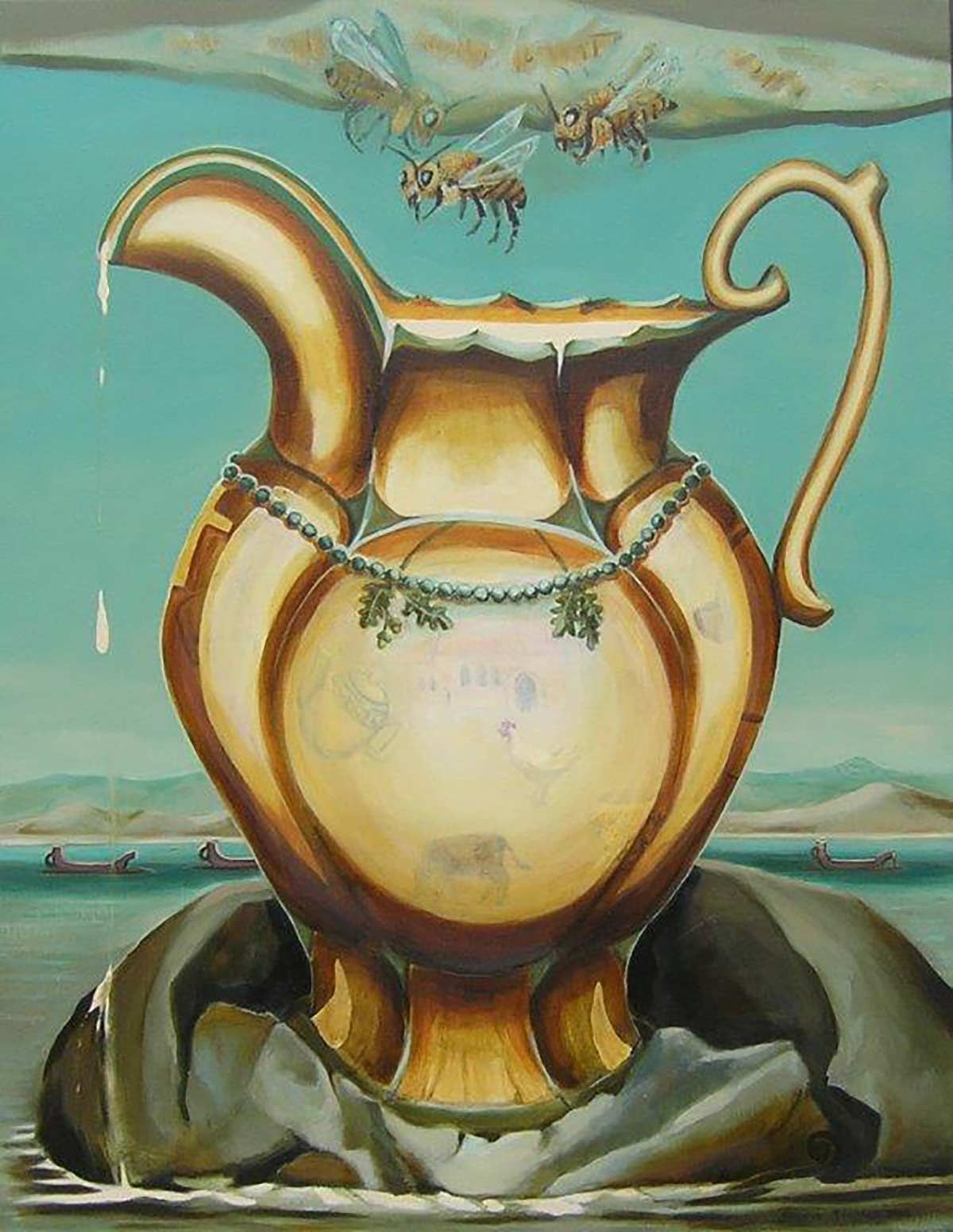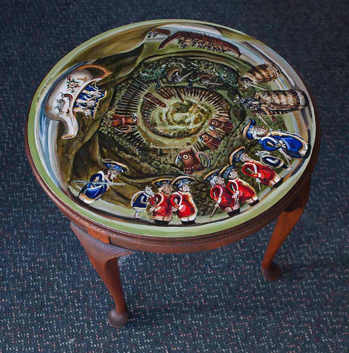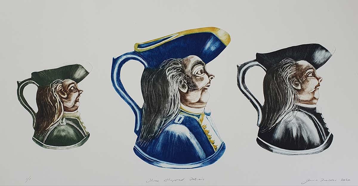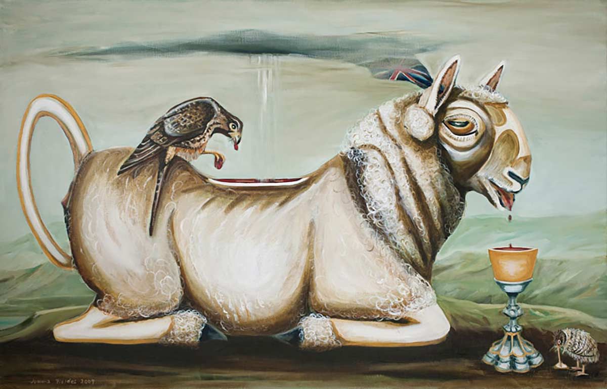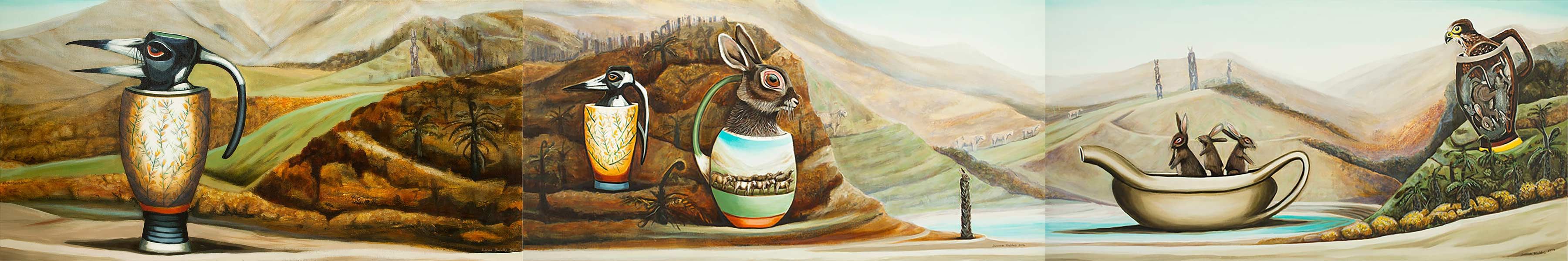 The dominant theme throughout Joanna Fieldes’ art career is the continuing impact of New Zealand’s colonial past on both its varied landscapes and the life forms, indigenous and introduced, that inhabit them. Through her paintings and prints she articulates serious narratives with a sense of humour, giving food for thought, bringing to life New Zealand’s past and present. She juxtaposes vessels, often in anthropomorphic guise in a rich tableau of the imported and indigenous within the landscape. The recurrent use of ceramic vessels dominates the work – acting both as containers of colonial culture and as the colonizers/colonized themselves.