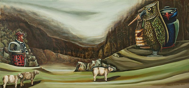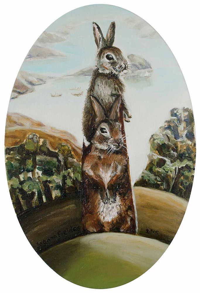 In this selection of oil paintings I have combined New Zealand landscapes with flora, fauna and still life objects in ways that suggest alternative subtexts to the ubiquitous stories of our colonial past. These works explore, from my Pakeha perspective, the colonization of New Zealand. Central to my theme is the lasting impact that European explorers, early colonial settlers and those that followed have had on the indigenous environment and inhabitants of this corner of the South Pacific. I depict meetings, greetings, and confrontations between colonizing ‘guests’ and their reluctant hosts, juxtaposed with subsequent transformations of the land. Introduced by our colonial forebears, invasive pests such as rabbits, gorse and magpies that we now endeavour to contain form a recurrent feature in these paintings.
