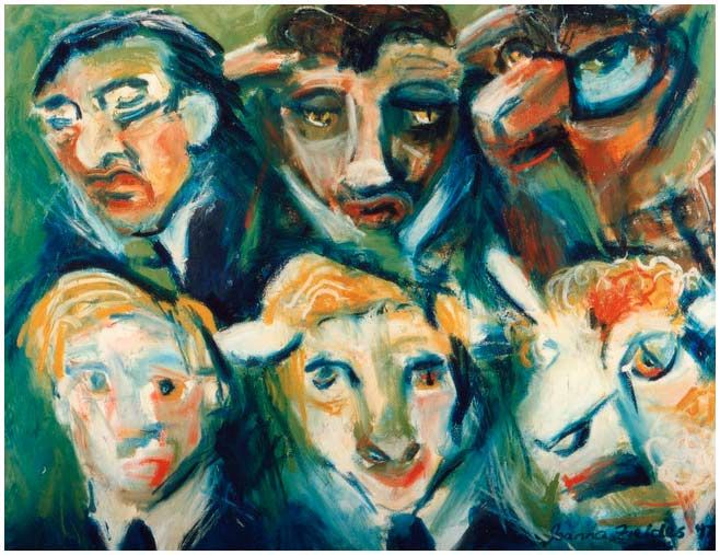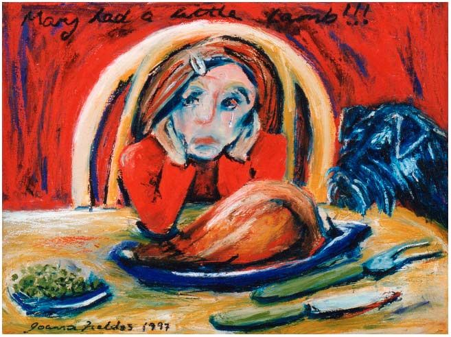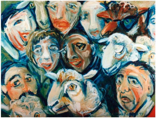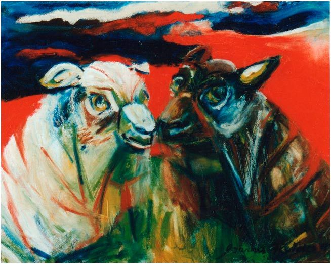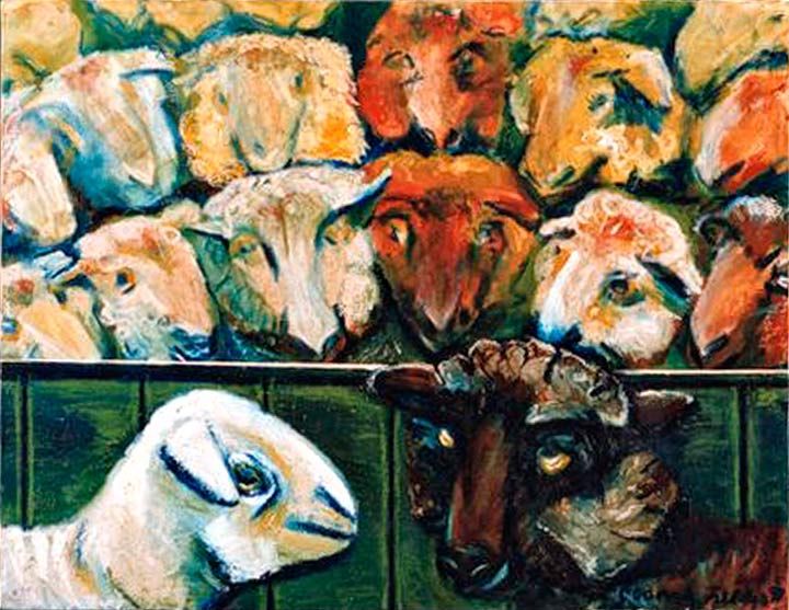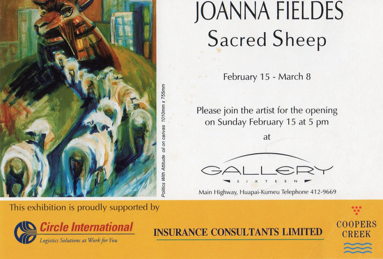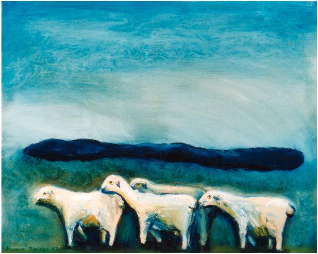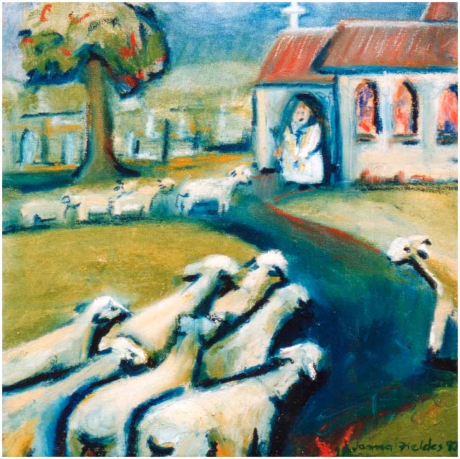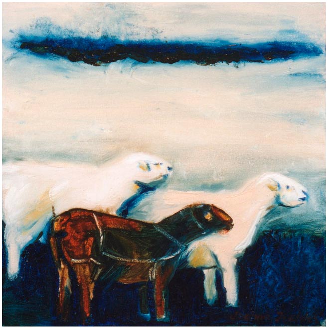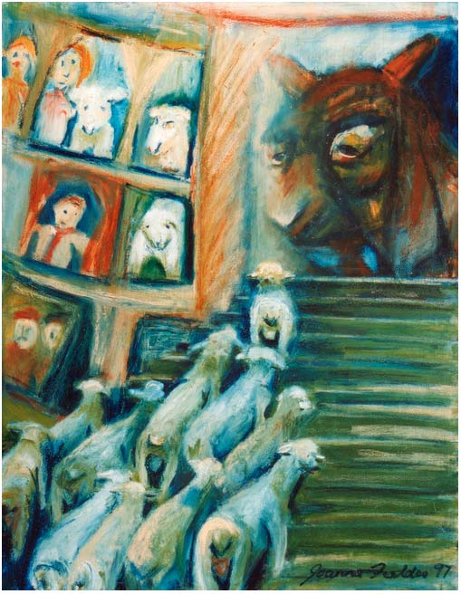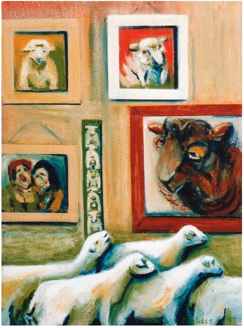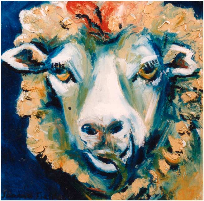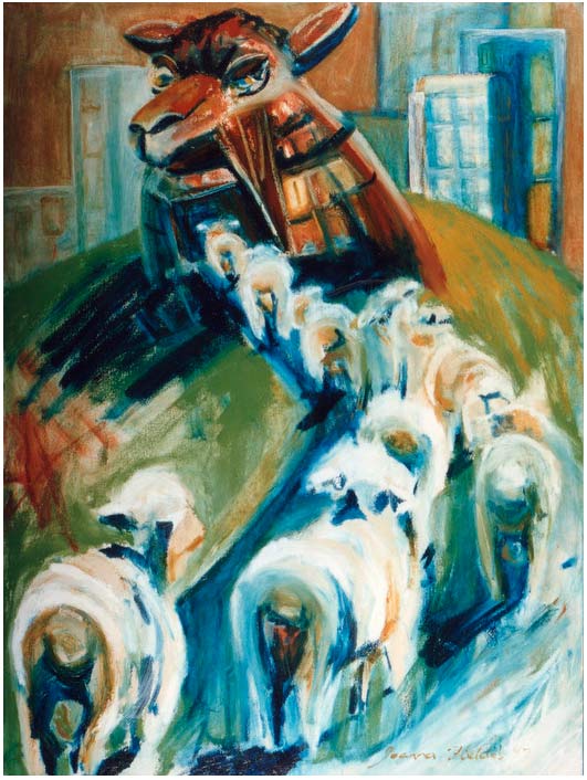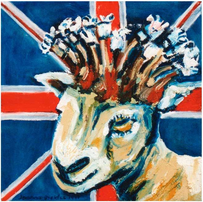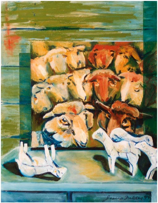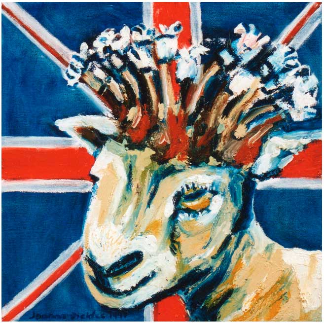 Sacred Sheep,1998 reveals an interesting exploitation of a national icon. The typical observations we make of ovine expression and herd instinct are the tools Joanna Fieldes uses to explore some of our currant political and social preoccupations or whims.